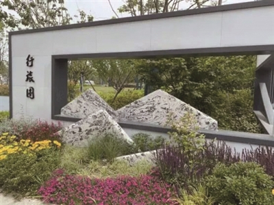 行旅图公园的名字取自北宋范宽的《溪山行旅图》,园内有廊架名为行旅廊,亭子名为溪山亭。公园河畔北岸设置骑行道和跑步道,南岸贯通跑步道,两岸局部有条件的区段设置漫步道,通过慢行系统将北塘画卷串联起来,形成一幅“舟于水中游,人在林中穿”的图景。