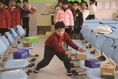 再看杭州市滨文小学,教学楼转角、公共通道也成了“临时运动场”。这一头,孩子们拿出花绳,拉上伙伴,一起去运动。那一角,竹节人大战“一触即发。只见课桌上,两个竹节人在激烈地打斗着。一方突然“前刺”,另一方躲闪不及,只好硬生生挺了一击。一来一回间,既有思维火花的碰撞,也增进了同学间的情谊。