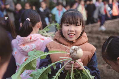 临近期末,在杭州市闻涛小学的农场里,一大波农作物迎来丰收。有的同学拔萝卜,有的同学挖芋头,还有的同学摘大白菜,丰收的喜悦就挂在孩子们脸上。